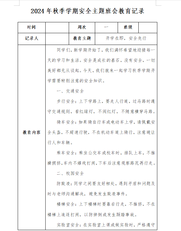 2024年秋季学期安全主题班会教育记录(共19周内容)