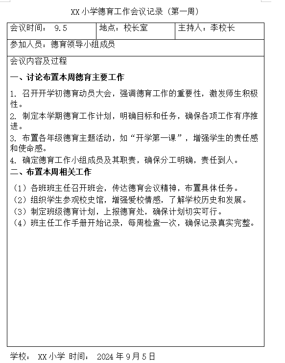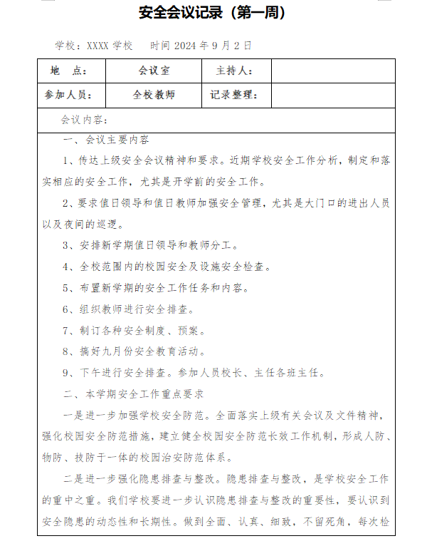 2024年秋季学期学校每周安全会议记录(全学期带内容模板)