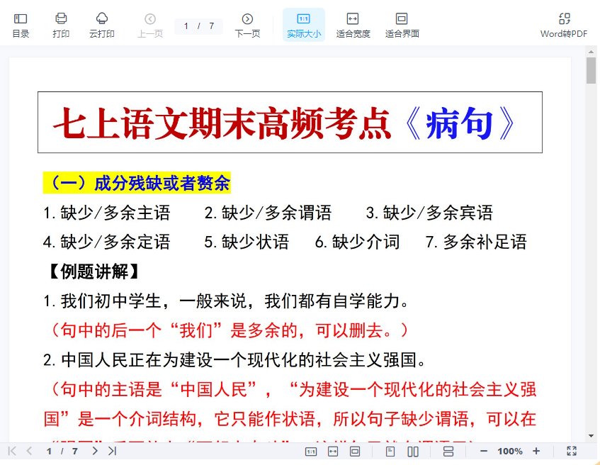 81份打包!7年级上册 课后练习题汇总,电子版PDF可打印【超高质量】
