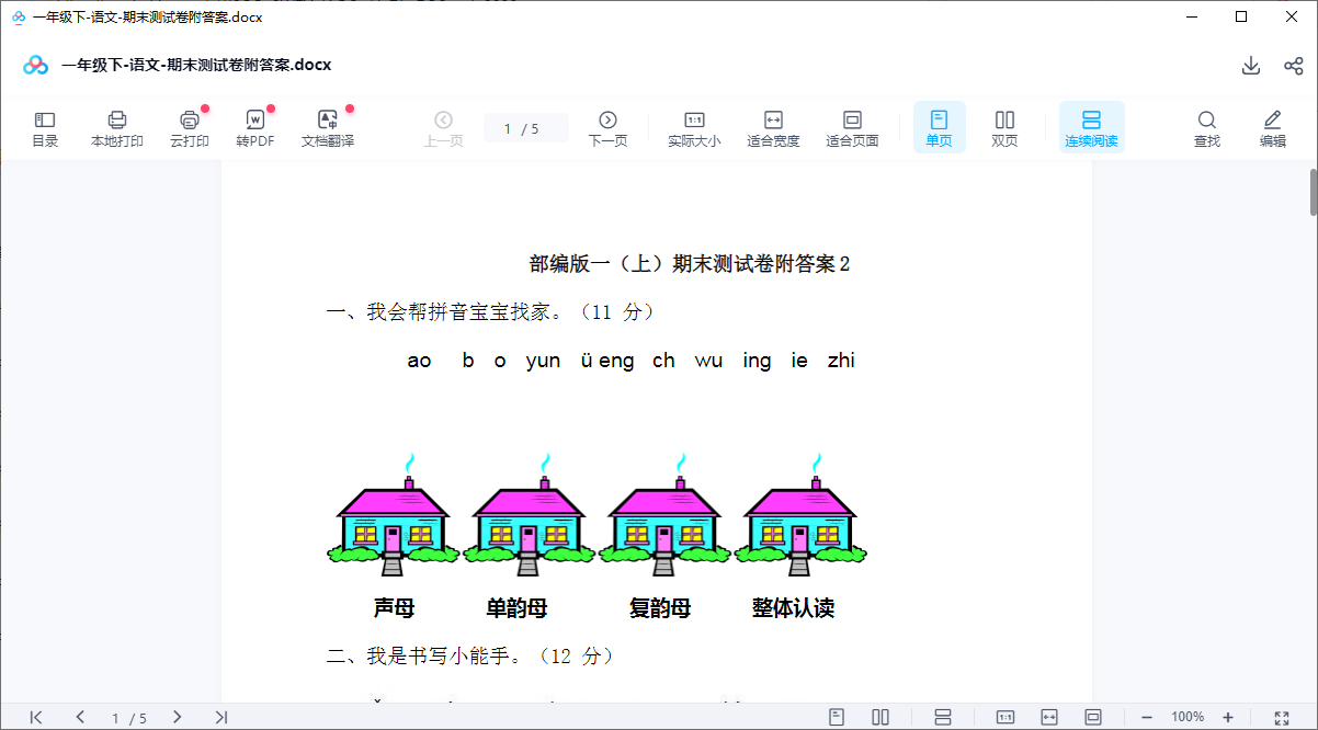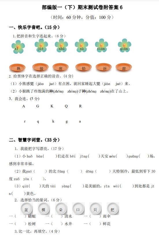 一年级下-语文-期末测试卷1+答案