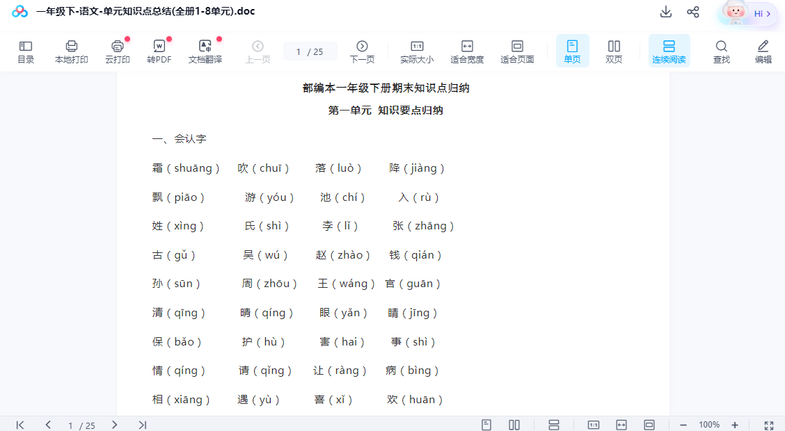一年级下-语文-单元知识点总结(全册1-8单元)【可打印】