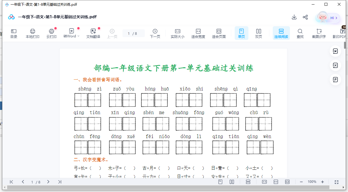 一年级下-语文1-8单元-同步练习