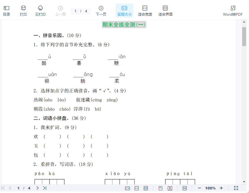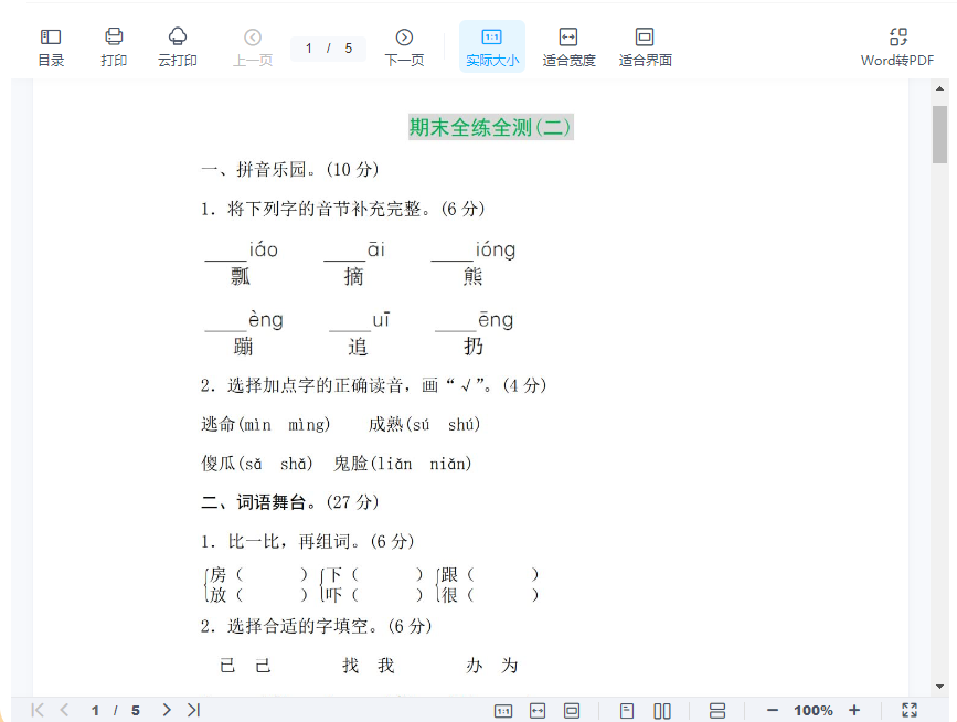 一年级下-语文-期末检测卷及答案