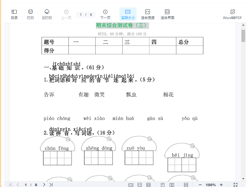 一年级下-语文-期末测试卷3+答案