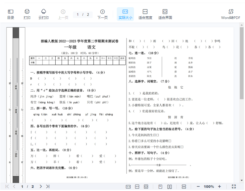 一年级下-语文-期末测试卷2+答案