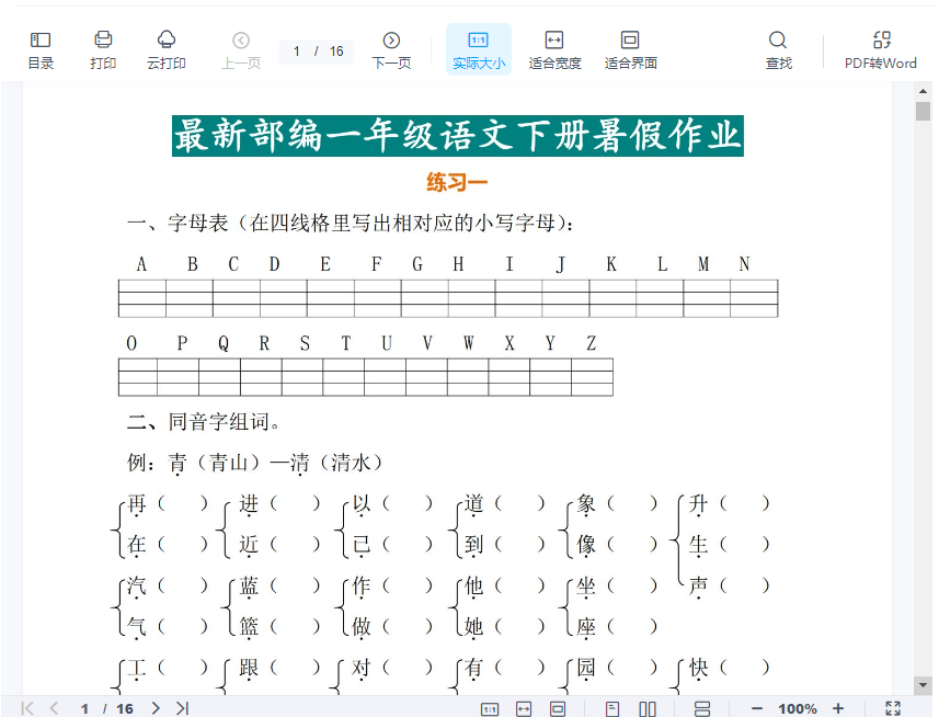 【2024暑】部编一年级语文下册暑假作业