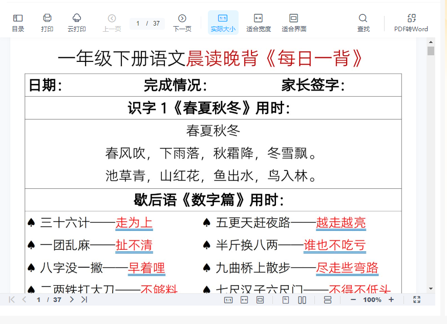 语文一年级下册晨读晚背每日一背(37页)