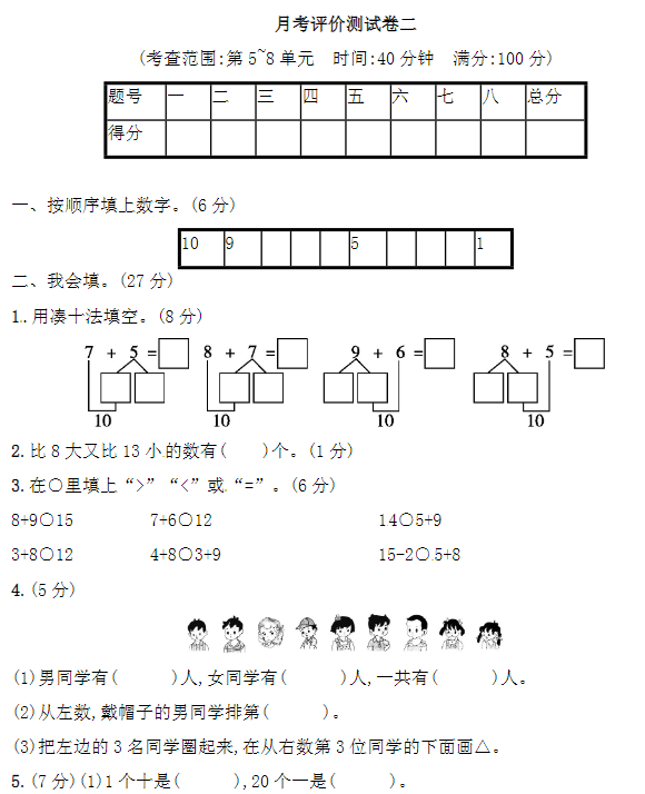 人教版一年级上册数学第八单元《20以内的进位加法》试卷1.doc