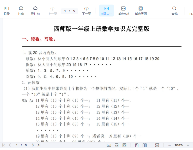 西师版一年级上册数学知识点完整版(5页)