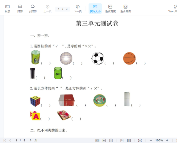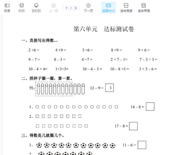 一年级上册-西师版-数学第三单元检测卷:3+答案