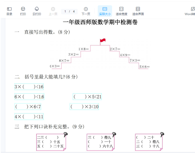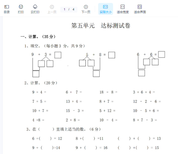 一年级上册-西师版-数学第四单元检测卷:1+答案