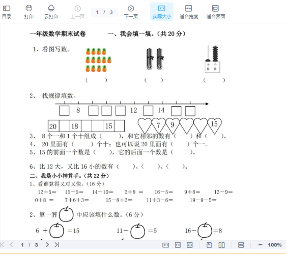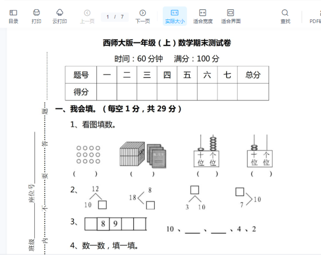 西师版一年级数学上册期末测试题(1)