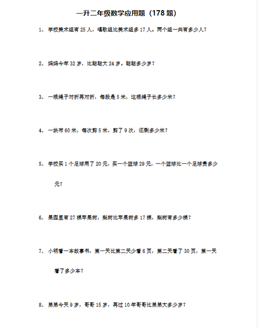 一升二数学应用题(178题)