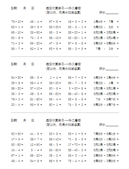 一升二数学暑假作业-元角分·加减计算-每日练习