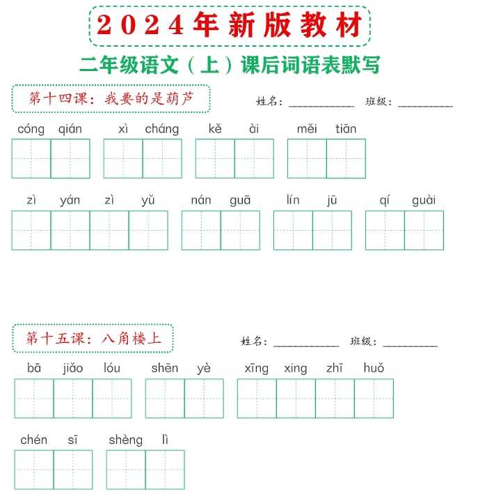 【2024秋季版新教材】 新版教材2上课后词语默写表【18页】