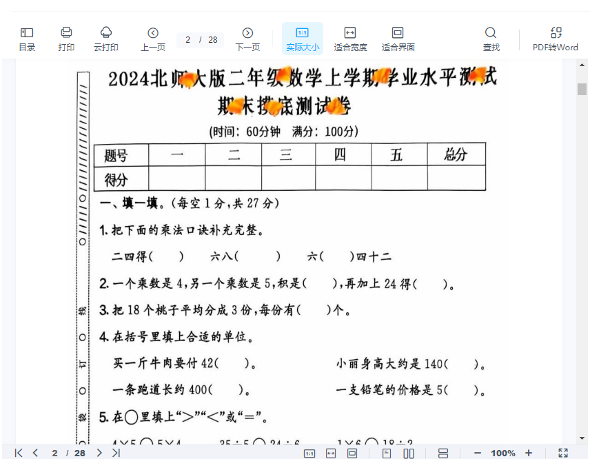 二年级上册数学练习题,单元试卷,期中期末试卷,技能提升(59项)