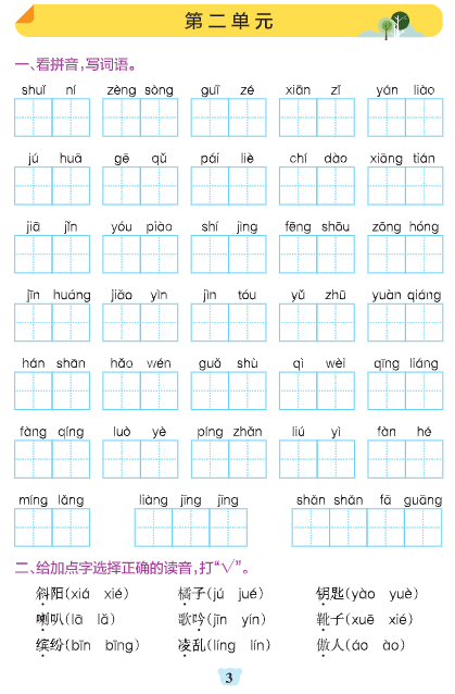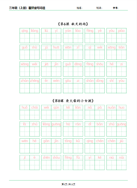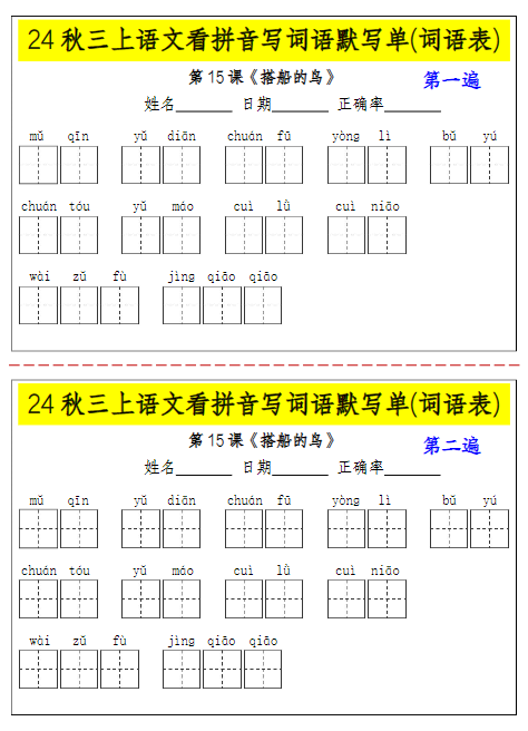 24秋三上语文期末看拼音写词语默写单(词语表)-2遍-含答案