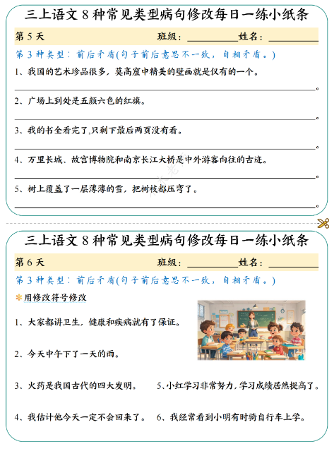 三(上)语文 8种常见类型病句修改每日一练小纸条