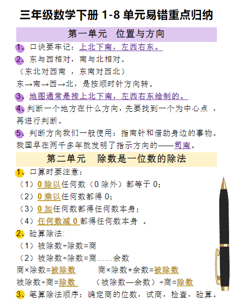 三年级数学下册1-8单元易错重点归纳,寒假抢先预习!可打印