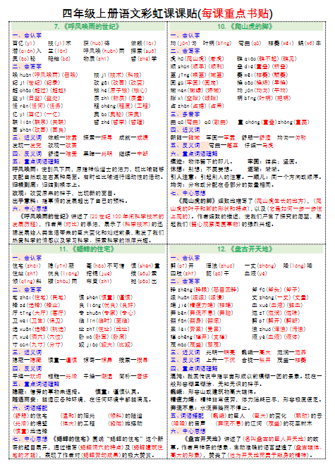 四年级上册语文彩虹课课贴(每课重点书贴)(1-12课)