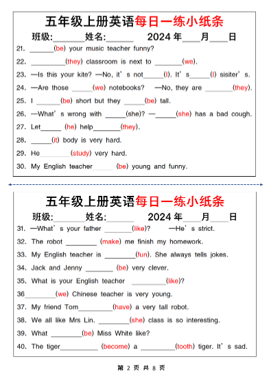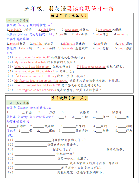 【英语】【通用】五年级英语上册英语每日一练小纸条