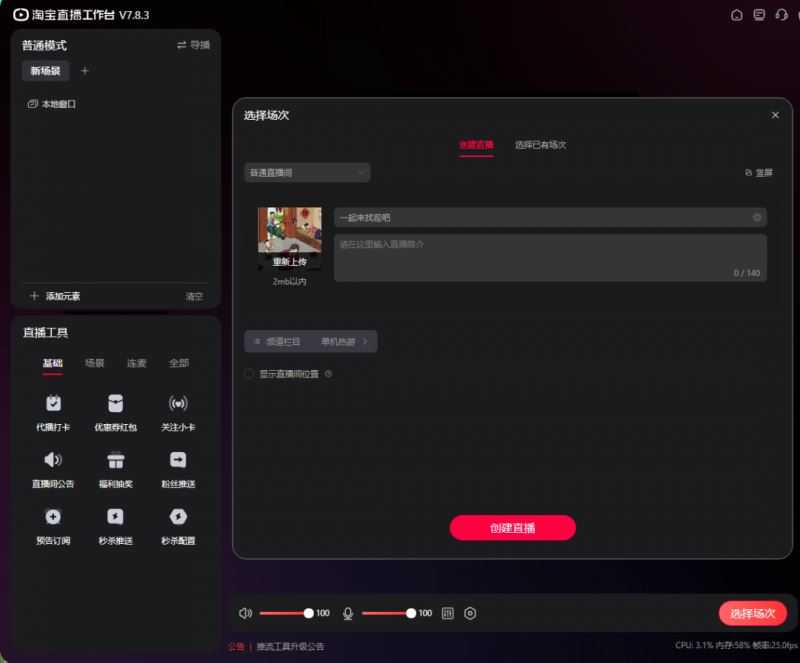 上图是我实操的一个玩小游戏的直播,具体怎么直播,需要用到电脑,在电脑上搜索安装好“淘宝直播主播工作台”这个软件,即可创建直播间,场景选择本地窗口的网页浏览器。