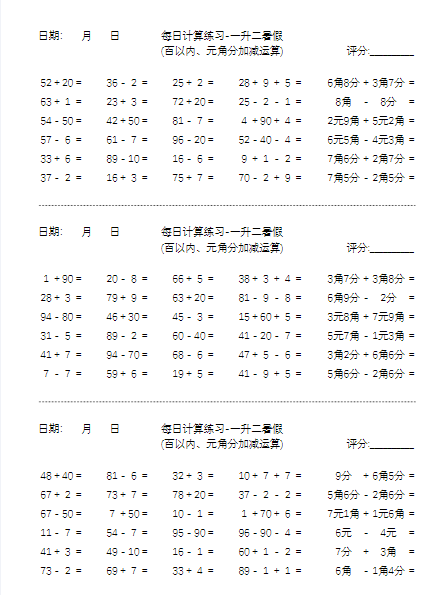一升二数学暑假作业-元角分·加减计算-每日练习