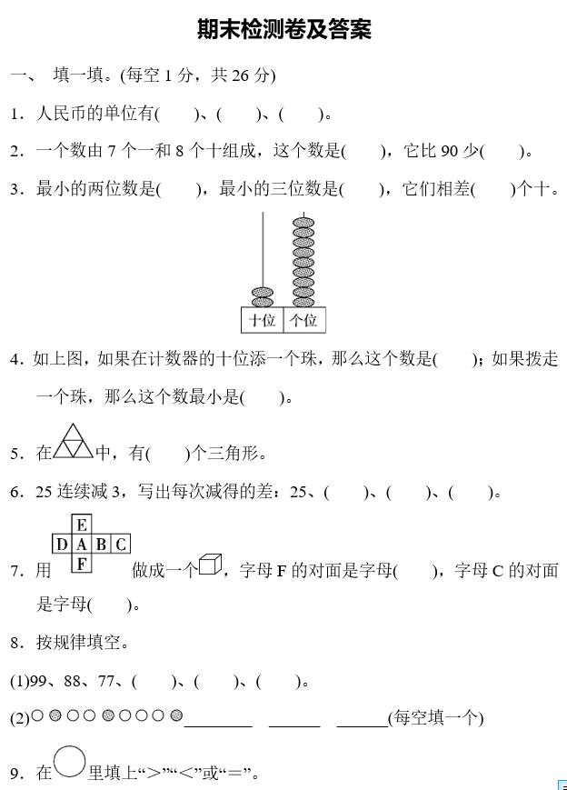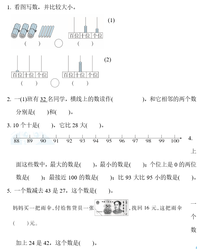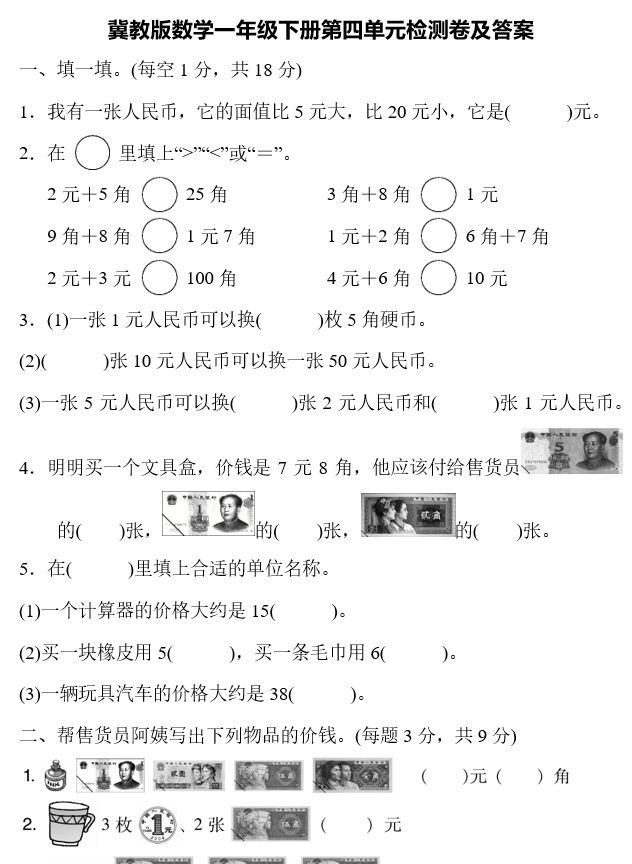 33份打包!一年级数学下【冀教版】资料【超高质量】