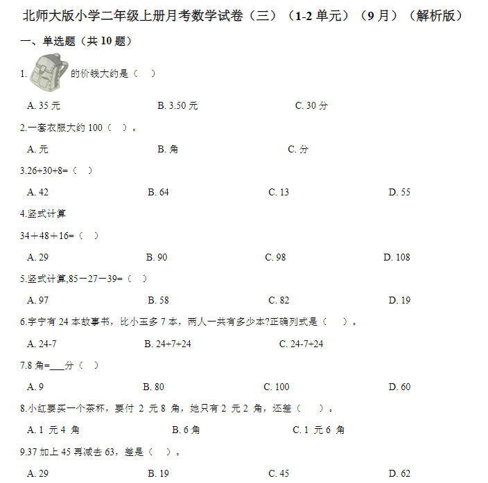 【北师大数学二上】 月考试卷