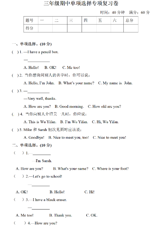 【人教PEP英语三上】 专项练习