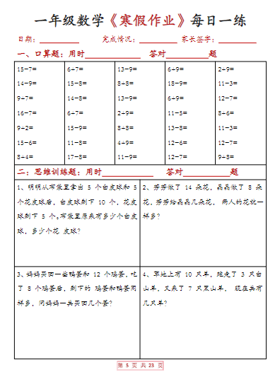 2025最新一年级数学 寒假作业每日一练(有答案)