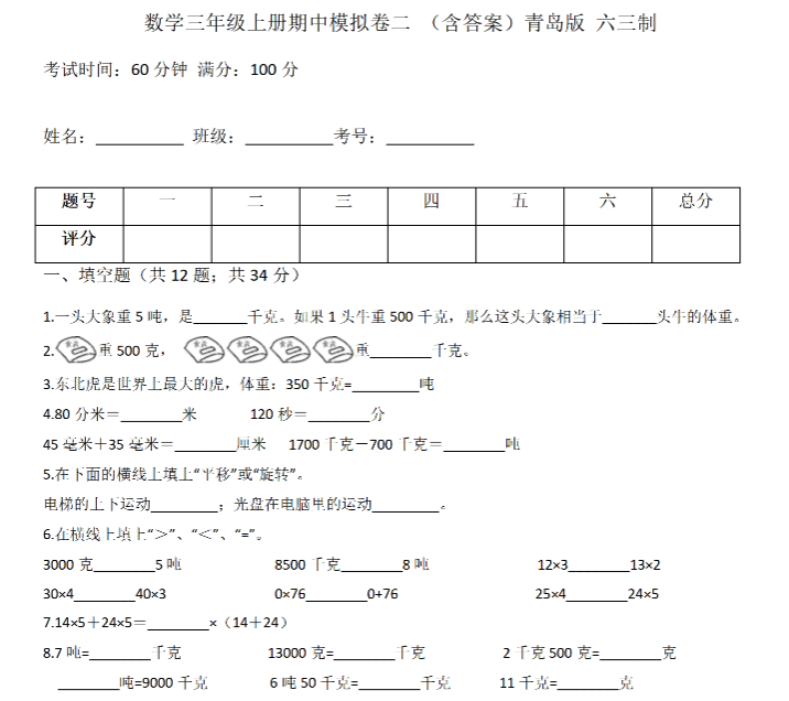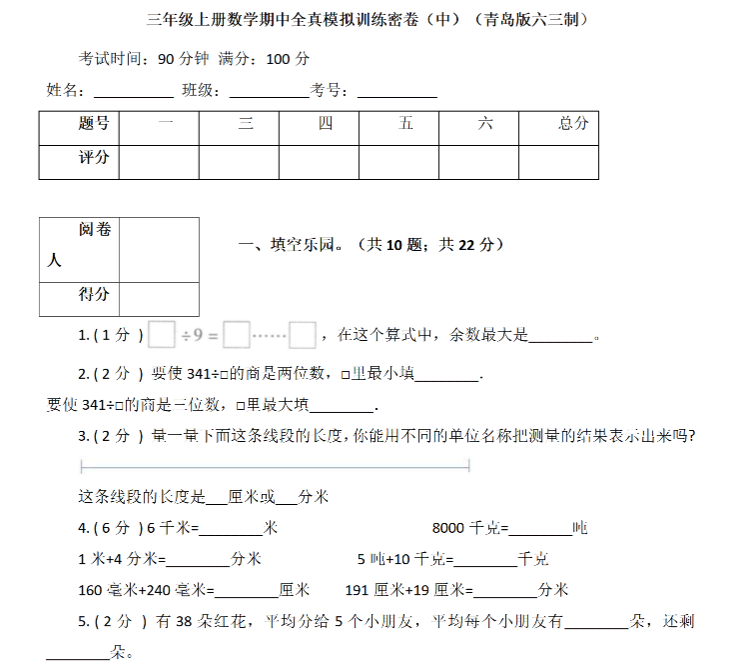 【青岛六三数学三上】 期中测试