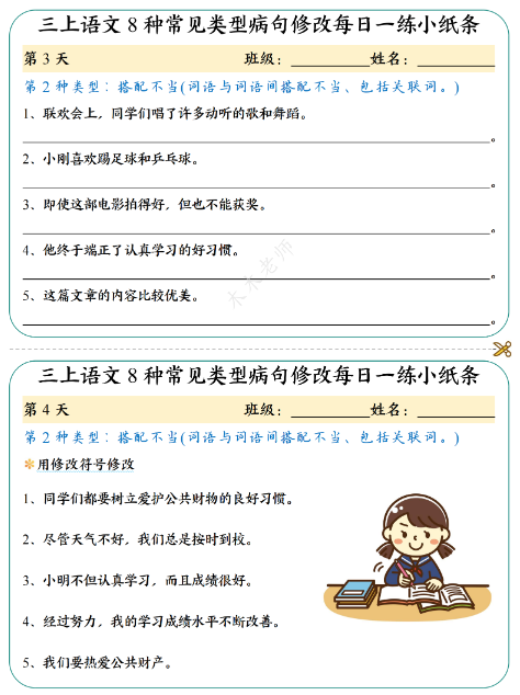 三(上)语文 8种常见类型病句修改每日一练小纸条