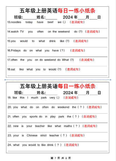 首页 > 全部 > 五上英语 > 【英语】【通用】五年级英语上册英语每日一练小纸条