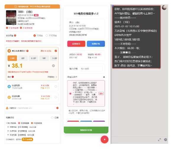 更了几次电影票教程了,这次补充个小工具,也是学习写代码的时候的练手之作,主要是外面的全自动报单报价太贵了,前期跑电影票代理的话,全自动好像用不到,所以整理了个半自动报单工具,能一键传图+查价+自定义话术,你只需要一键识别,一键复制发送就行,会相对省很多麻烦,用户方体验也会很棒 !