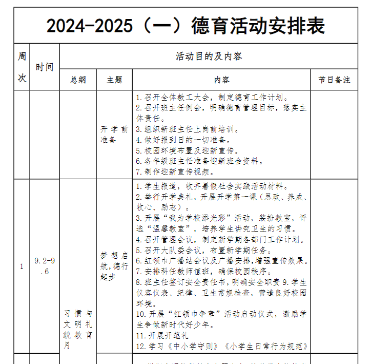 2024-2025德育工作活动安排表